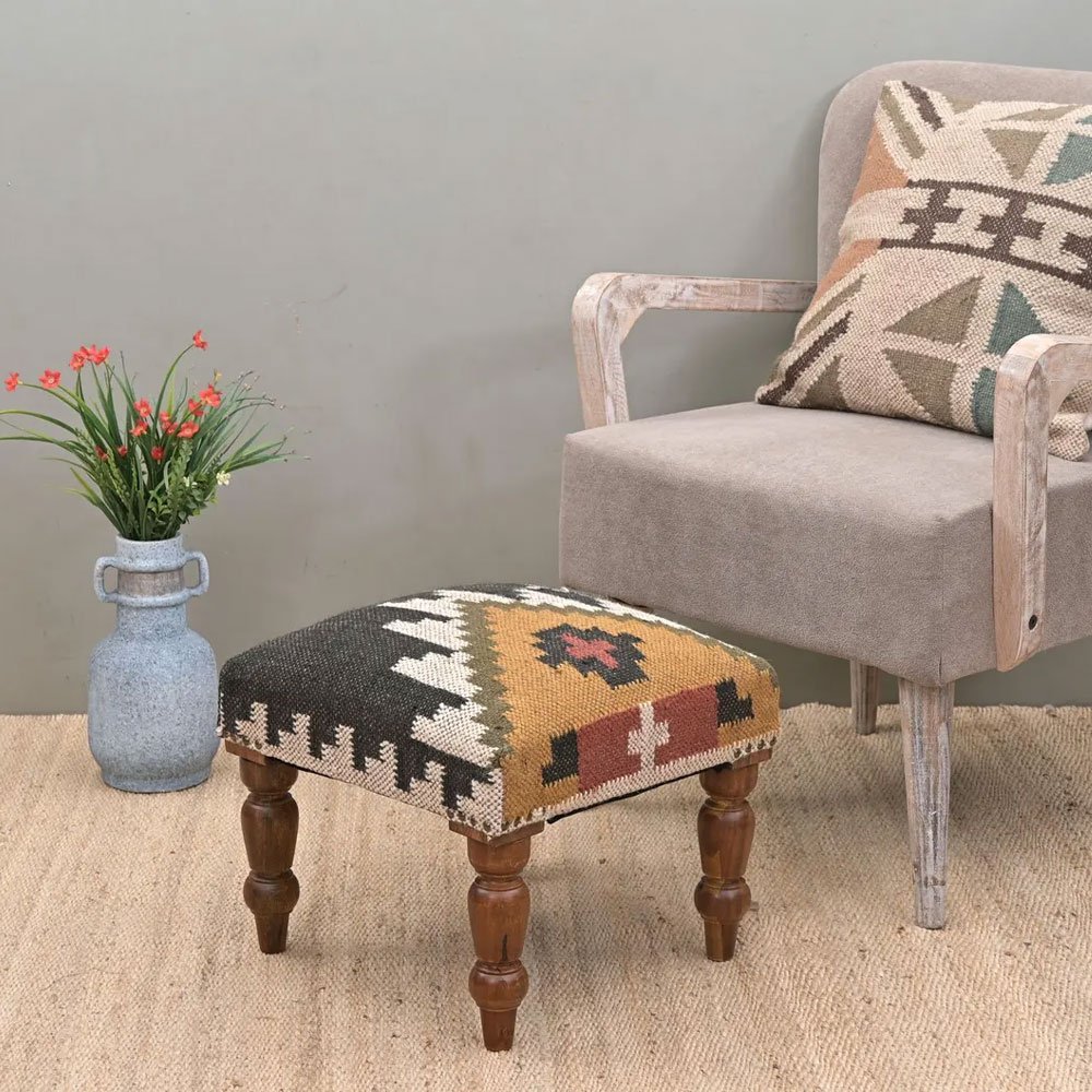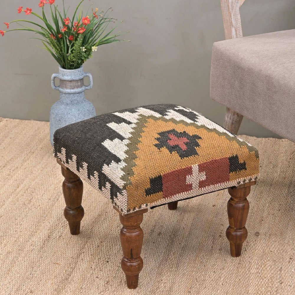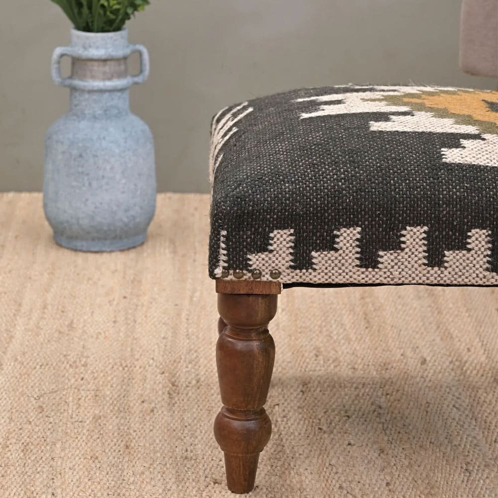 - Durable et élégant : Bois d’acacia pour la solidité, tissu Kilim pour le charme intemporel